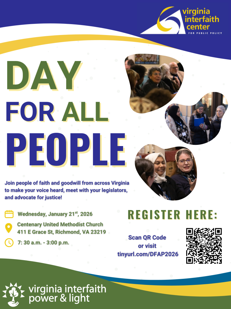 Day for All People is our annual Advocacy Day in partnership with Virginia Interfaith Power and Light. We bring hundreds of people of faith and goodwill from across Virginia to Richmond to engage in the legislative process. Join us in- person for inspirational presentations, informative workshops, and effective advocacy on Wednesday, January 21, 2026. All are invited to join with other motivated Virginians to make your voices heard on economic, racial, social and environmental justice issues. You will learn about our priority policy issues from dynamic speakers and workshops, meet with your state legislators, and engage with advocates in your region.