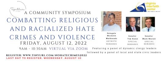 On the 5th anniversary of the attacks in Charlottesville, the Virginia Interfaith Center for Public Policy (VICPP) invites you to join us for a community symposium on combatting religious and racialized hate crimes and violence in Virginia. This event will culminate VICPP’s “Together in Faith” project in partnership with the Prince William County Police Department and springboard into a statewide effort. You will hear special remarks from U.S. Senators Tim Kaine and Mark Warner and a keynote from Delegate Michelle Maldonado. The program features a panel of dynamic faith leaders in Prince William County, followed by a panel of civic leaders that will include Prince William County Supervisor Margaret Franklin, who represents the Woodbridge district where hate crime incidents have occurred within the past five years, and the FBI Virginia field office which investigates hate crimes.