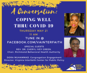 Make sure to tune in at 11am on Thursday, May 21 to hear from Rev. Dr. Cheryl Ivey Green, Chair of the Richmond Behavioral Health Authority, and Dora Muhammad, VICPP Congregational Engagement Director.