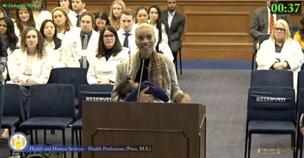 A visibly nervous Roshay Richardson stepped up to the podium, cradling her infant son in her arms. She and her husband left their house in Danville at 4:30 a.m. to make the three-hour drive to Richmond so she could testify before the Virginia House of Delegates’ Subcommittee on Health Professions on January 23, 2024.