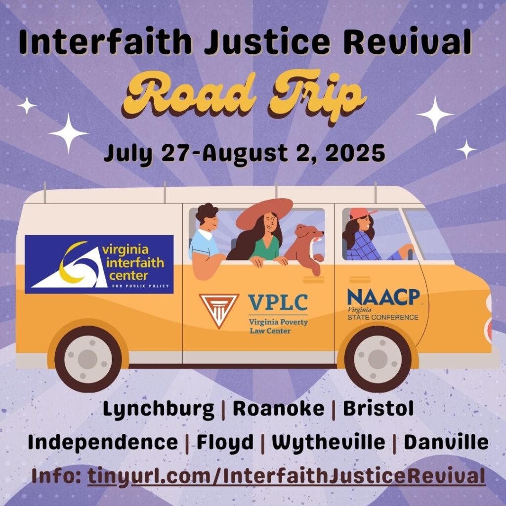 This Sunday, July 27, staff from the Virginia Interfaith Center for Public Policy (VICPP), the Virginia Poverty Law Center (VPLC)) and the Virginia NAACP (NAACPVA) will head to cities and towns across the commonwealth for a special “Interfaith Justice Revival” tour Sunday, July 27, to Saturday, August 2, offering fellowship, food, and powerful conversations. Taking inspiration from old-school religious gatherings, faith and community leaders will speak about the integral ties between faith and justice and the importance of civic engagement in anticipation of the November election. This tour will include nine events in communities throughout the western half of the state over seven days.